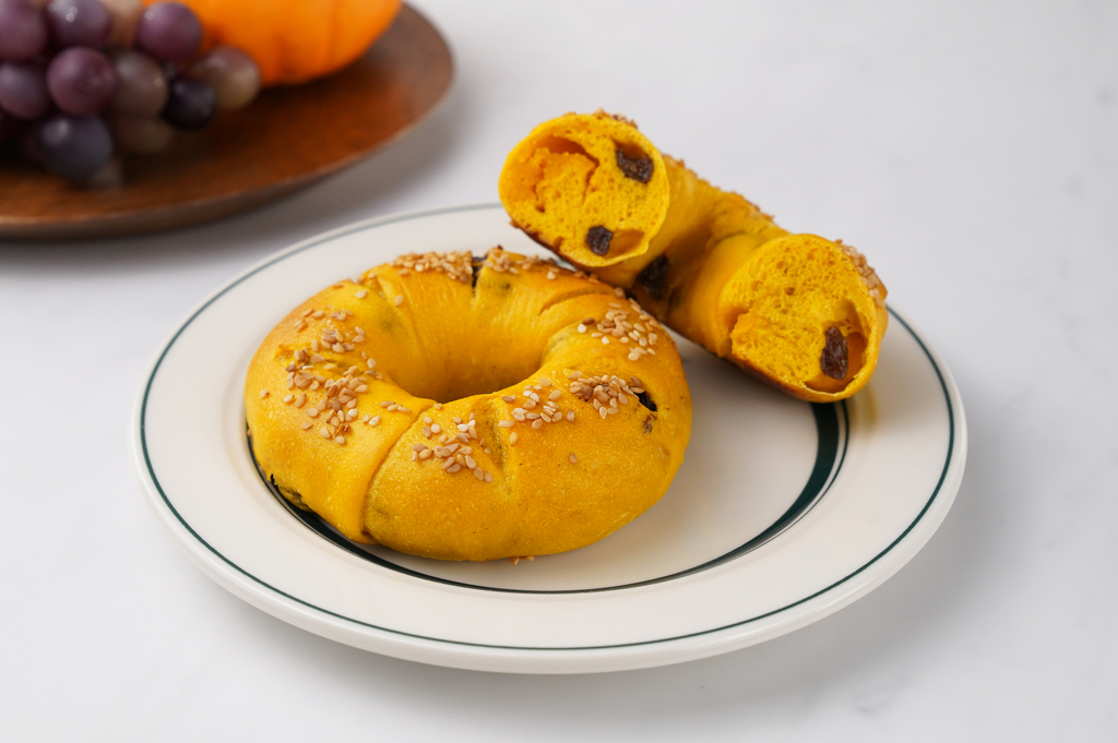- レーズンを練りこんだかぼちゃ生地で、かぼちゃ餡を巻き込んだもちもちのベーグル。香ばしいゴマがアクセント。