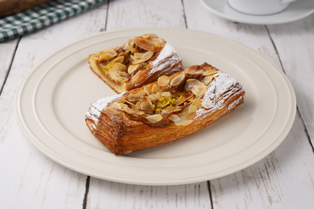 - 塩キャラメルカスタードを絞り、クルミとローストしたアーモンドをのせ、香ばしく焼きあげたデニッシュ。